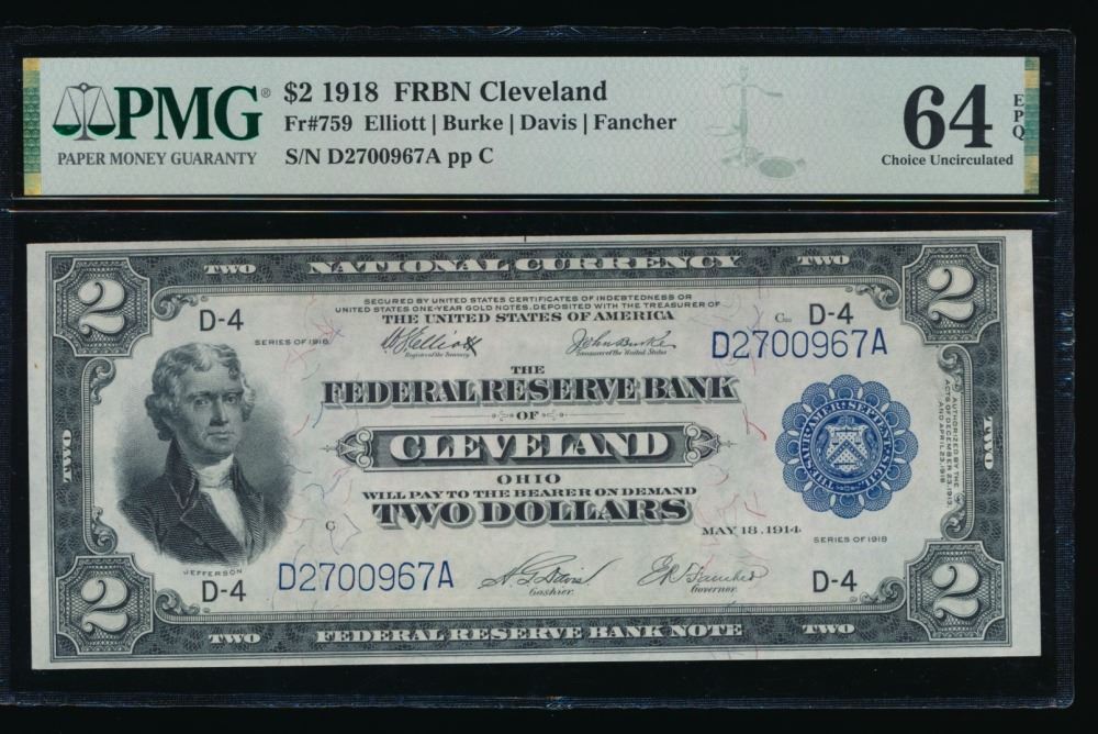 One 1918 $2 Cleveland FRBN PMG 64EPQ.