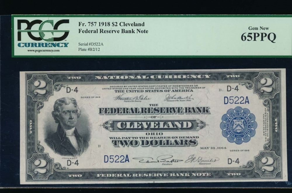 One 1918 $2 Cleveland Federal Reserve Bank Note PCGS 65PPQ.