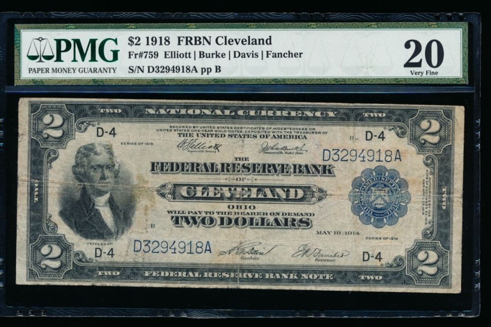 One 1918 $2 Cleveland Federal Reserve Bank Note PMG 20.