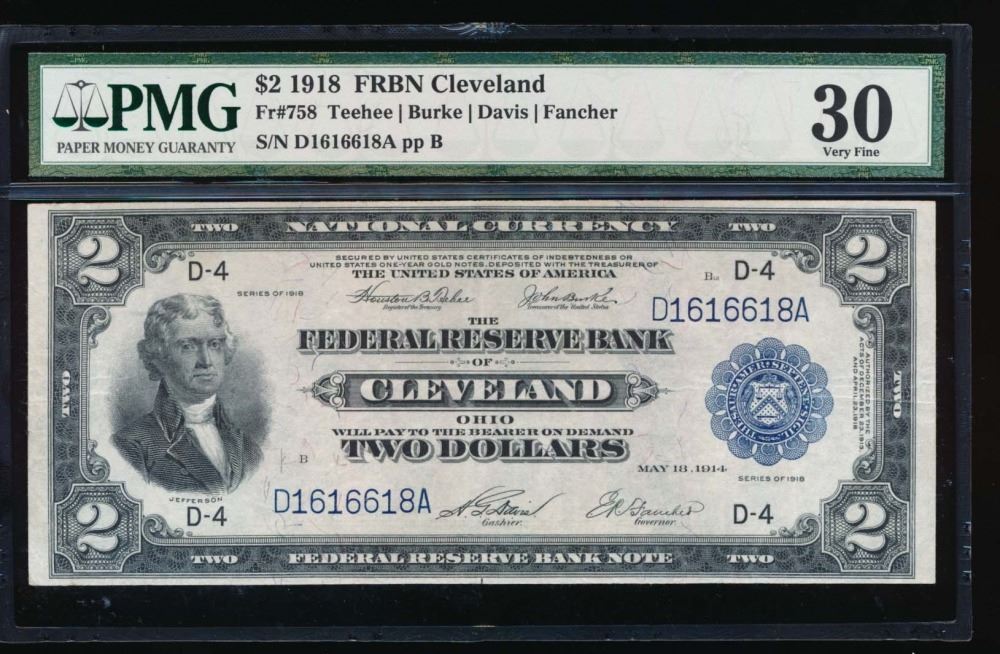 One 1918 $2 Cleveland Federal Reserve Bank Note PMG 30.