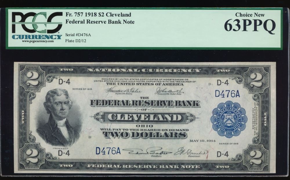 One 1918 $2 Cleveland Federal Reserve Note PCGS 63PPQ.