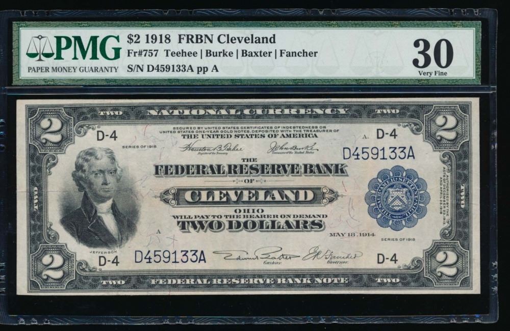 One 1918 $2 Cleveland Federal Reserve Note PMG 30.
