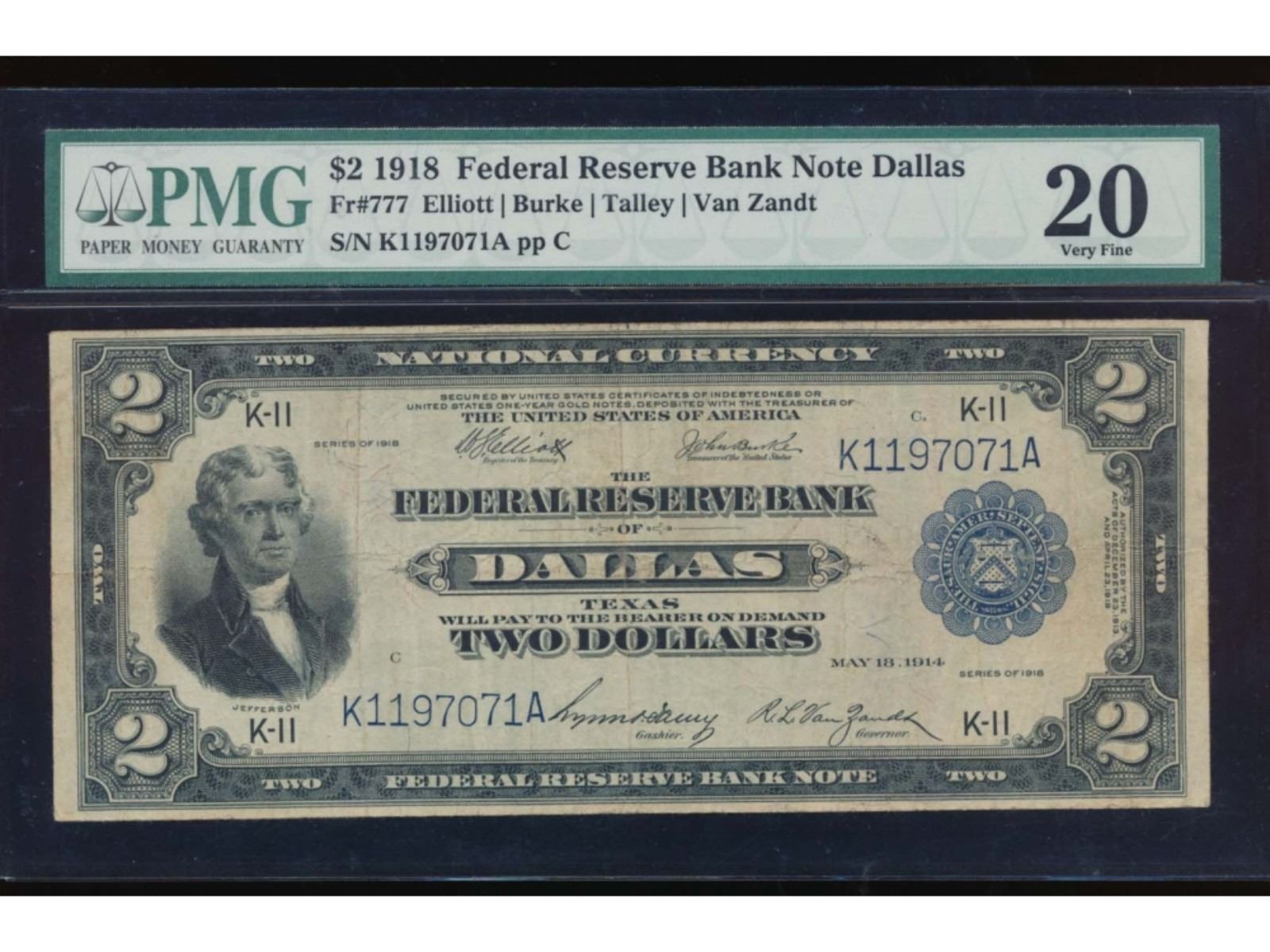 One 1918 $2 Dallas Federal Reserve Bank Note PMG 20.