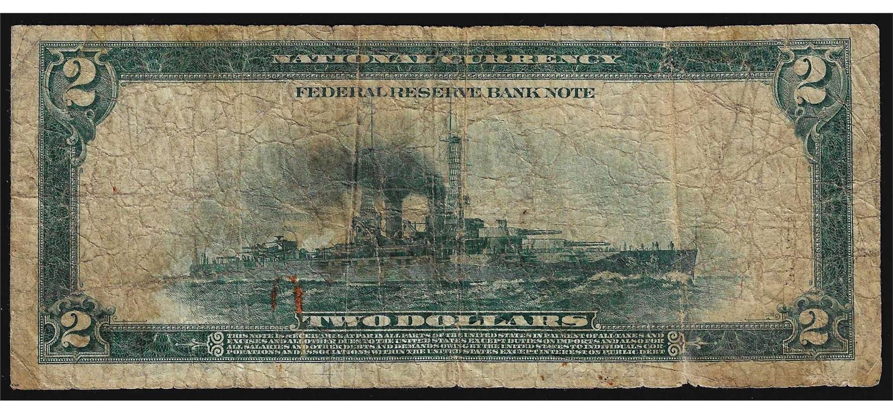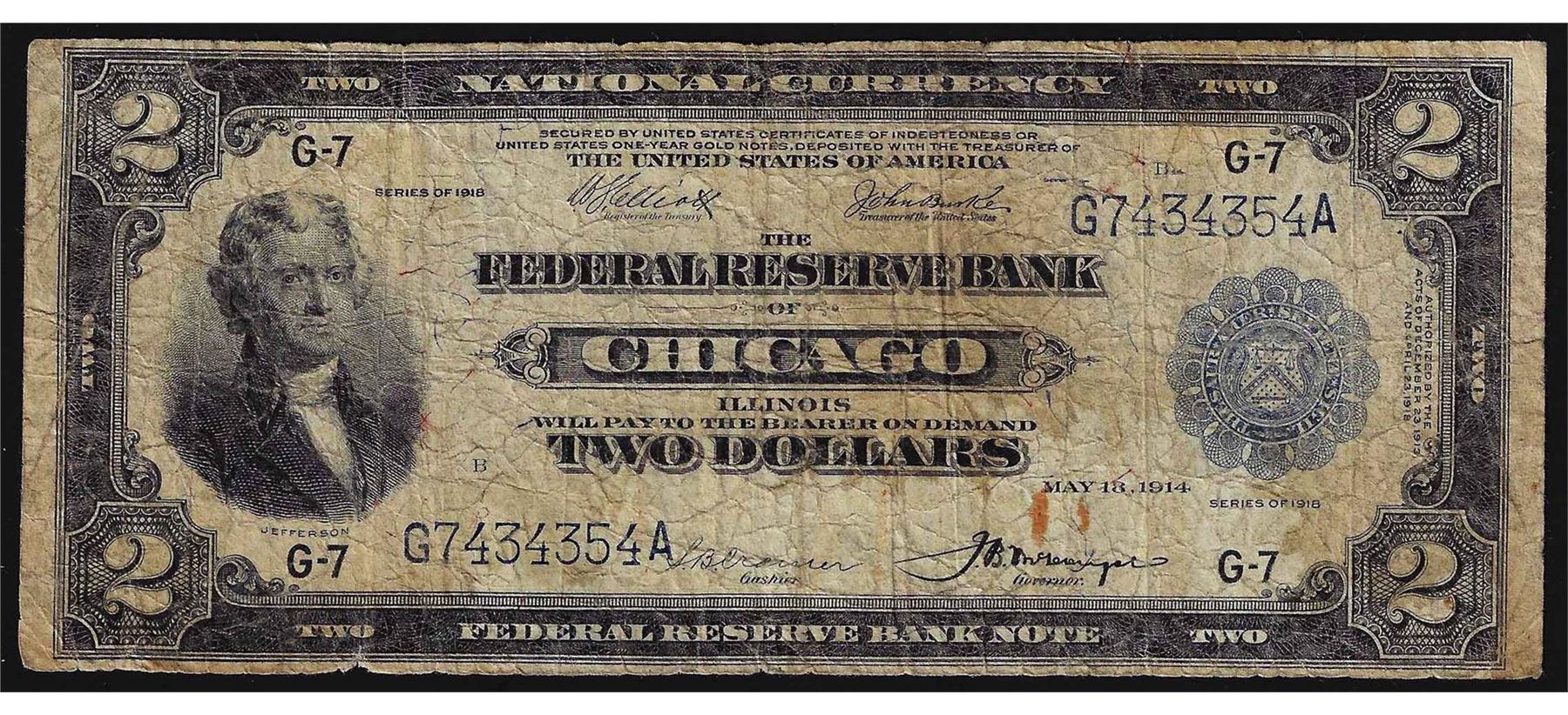 One 1918 $2 Federal Reserve Bank of Chicago National Currency Note.