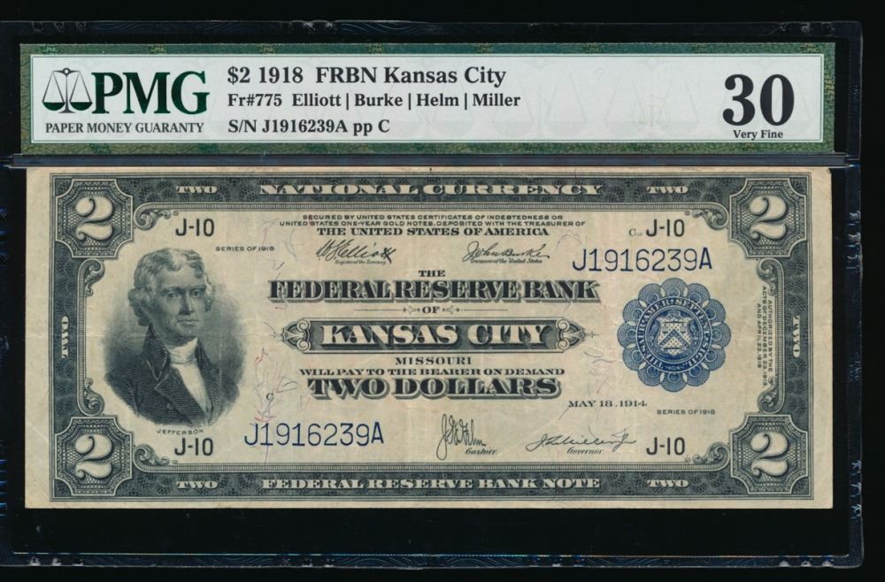 One 1918 $2 Kansas City Federal Reserve Bank Note PMG 30.