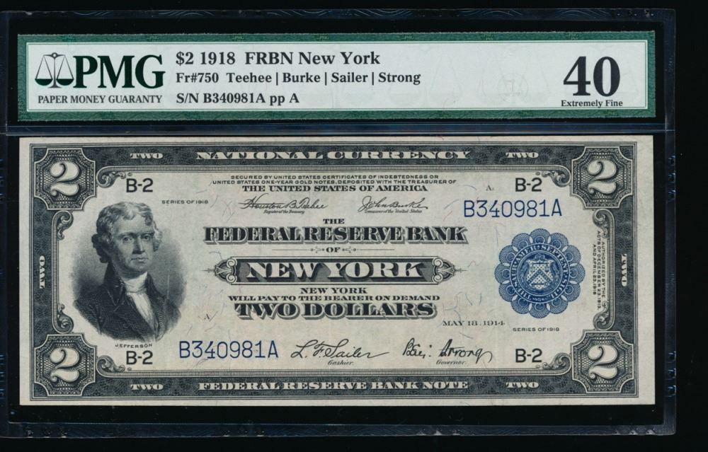 One 1918 $2 Large New York Federal Reserve Note PMG 40.