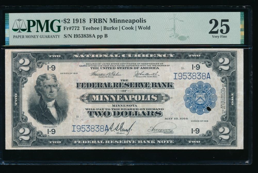 One 1918 $2 Minneapolis FRBN PMG 25.