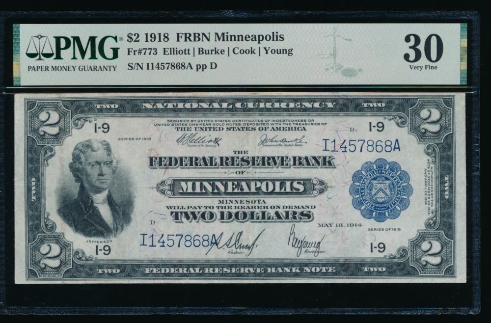 One 1918 $2 Minneapolis FRBN PMG 30.