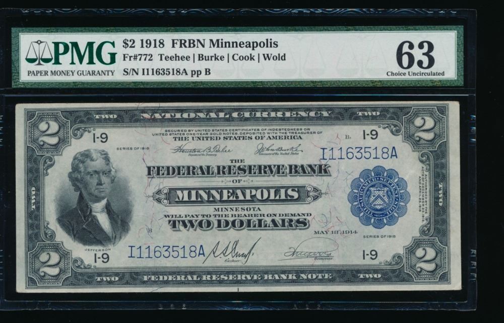 One 1918 $2 Minneapolis Federal Reserve Bank Note PMG 63.