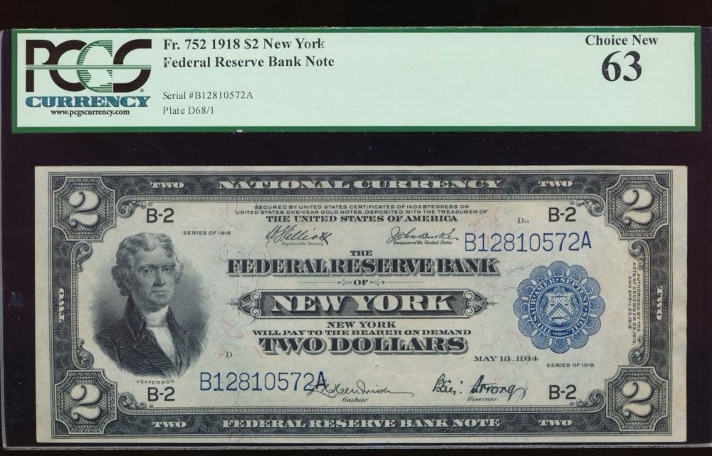 One 1918 $2 New York Federal Reserve Bank Note PCGS 63.