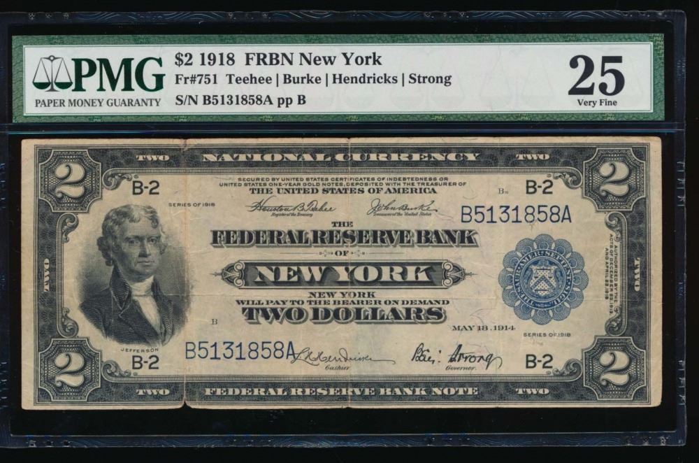 One 1918 $2 New York Federal Reserve Bank Note PMG 25.