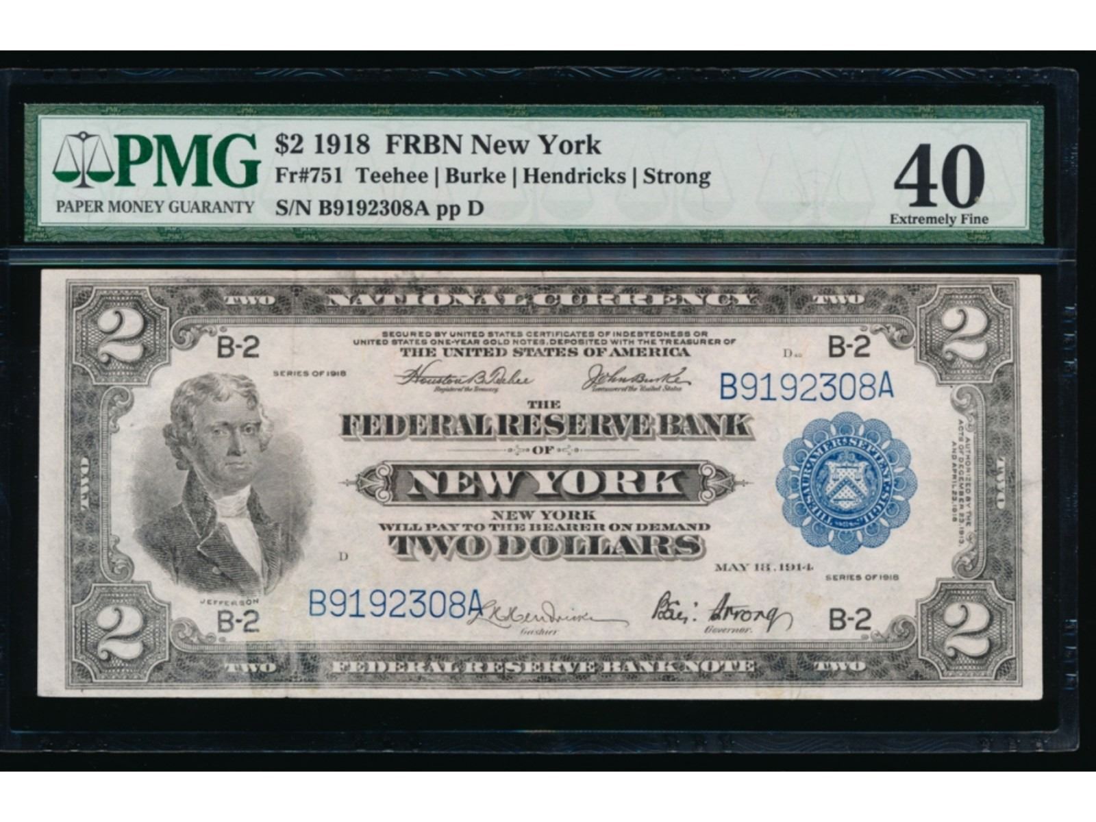 One 1918 $2 New York Federal Reserve Bank Note PMG 40.