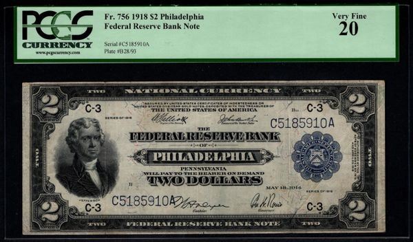 One 1918 $2 Philadelphia FRBN PCGS 20.