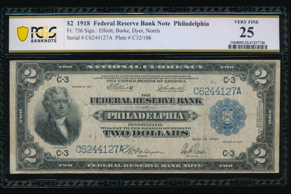 One 1918 $2 Philadelphia FRBN PCGS 25.