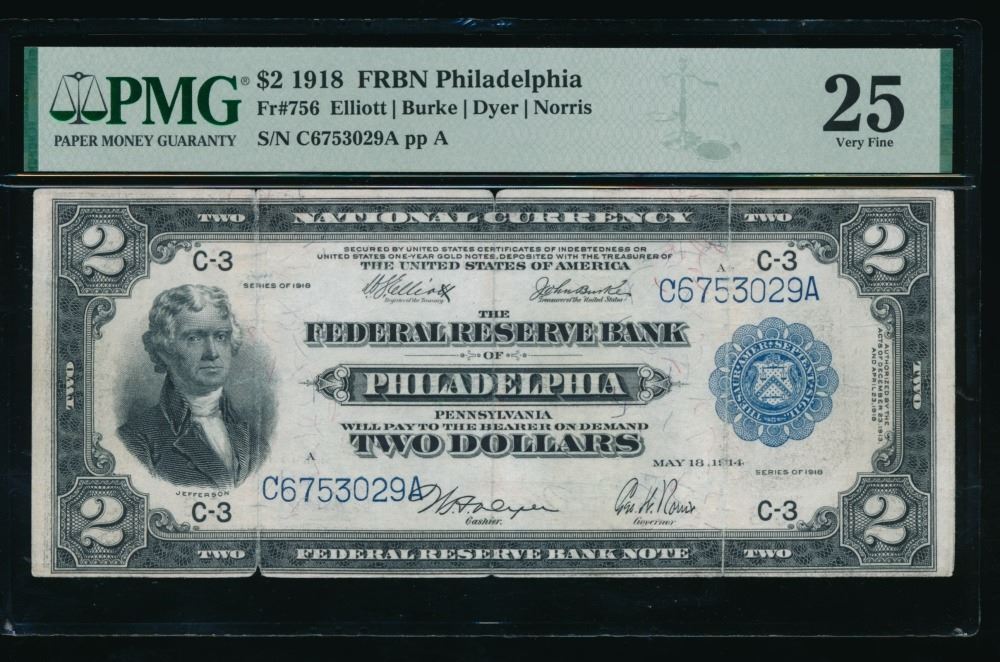 One 1918 $2 Philadelphia FRBN PMG 25.
