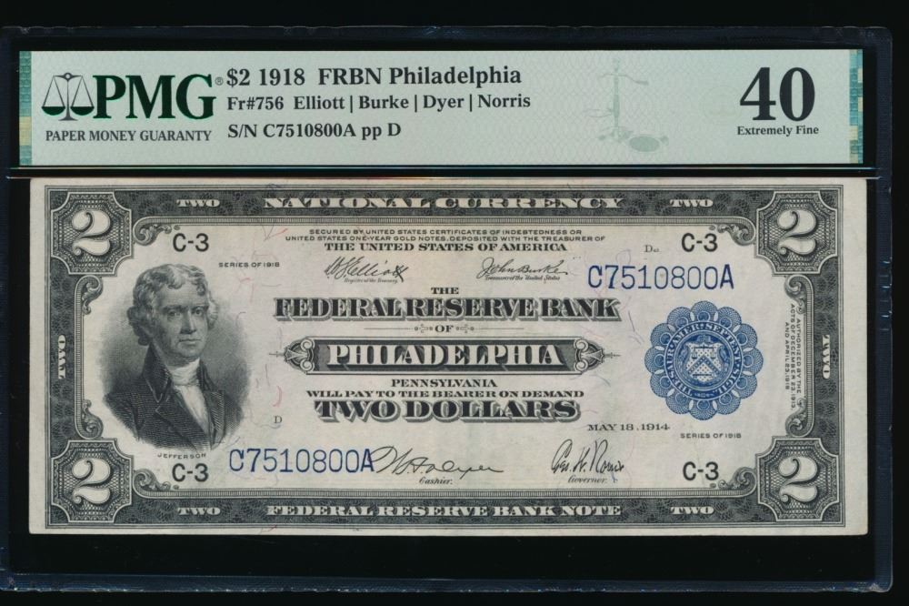 One 1918 $2 Philadelphia FRBN PMG 40.