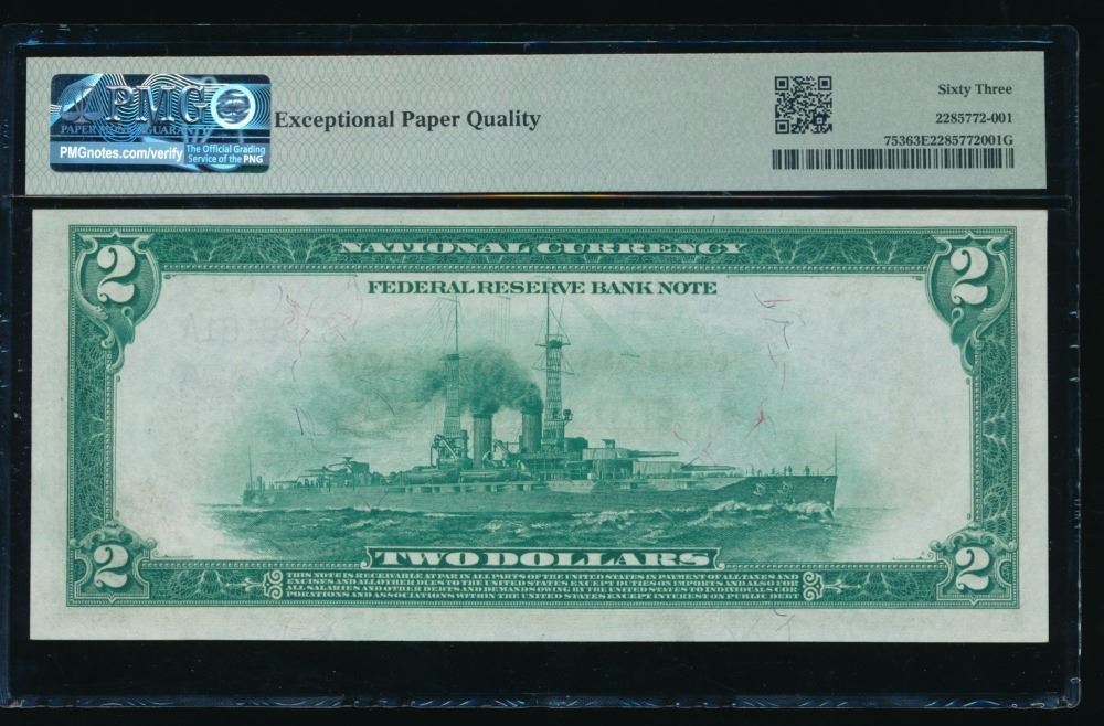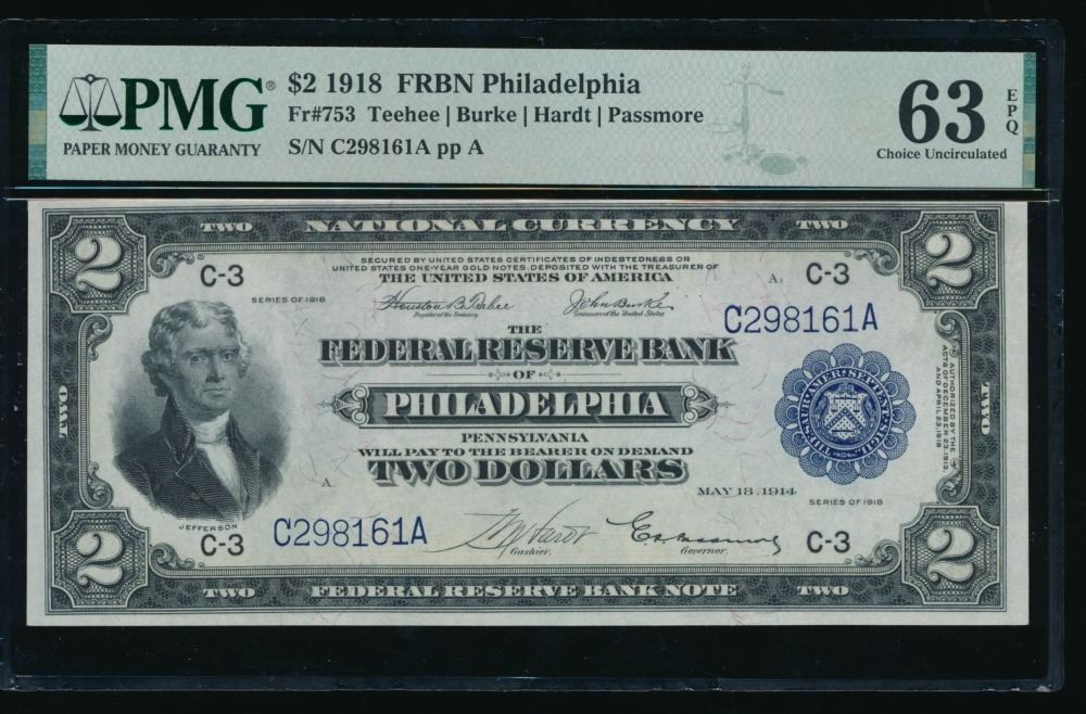 One 1918 $2 Philadelphia FRBN PMG 63EPQ.