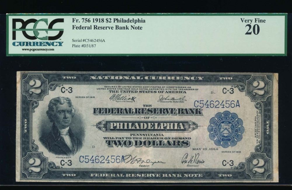 One 1918 $2 Philadelphia Federal Reserve Bank Note PCGS 20.