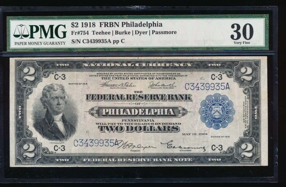 One 1918 $2 Philadelphia Federal Reserve Bank Note PMG 30.
