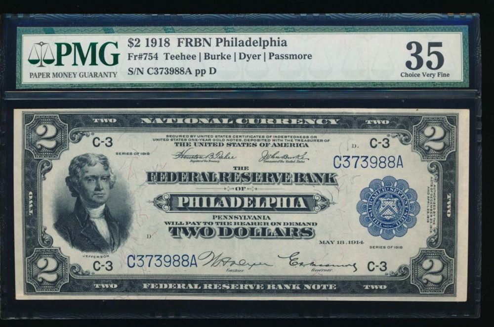One 1918 $2 Philadelphia Federal Reserve Bank Note PMG 35.