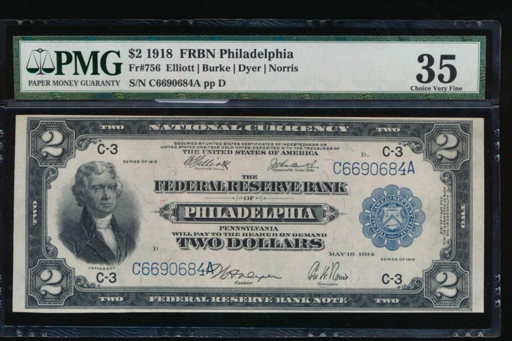 One 1918 $2 Philadelphia Federal Reserve Note PMG 35.
