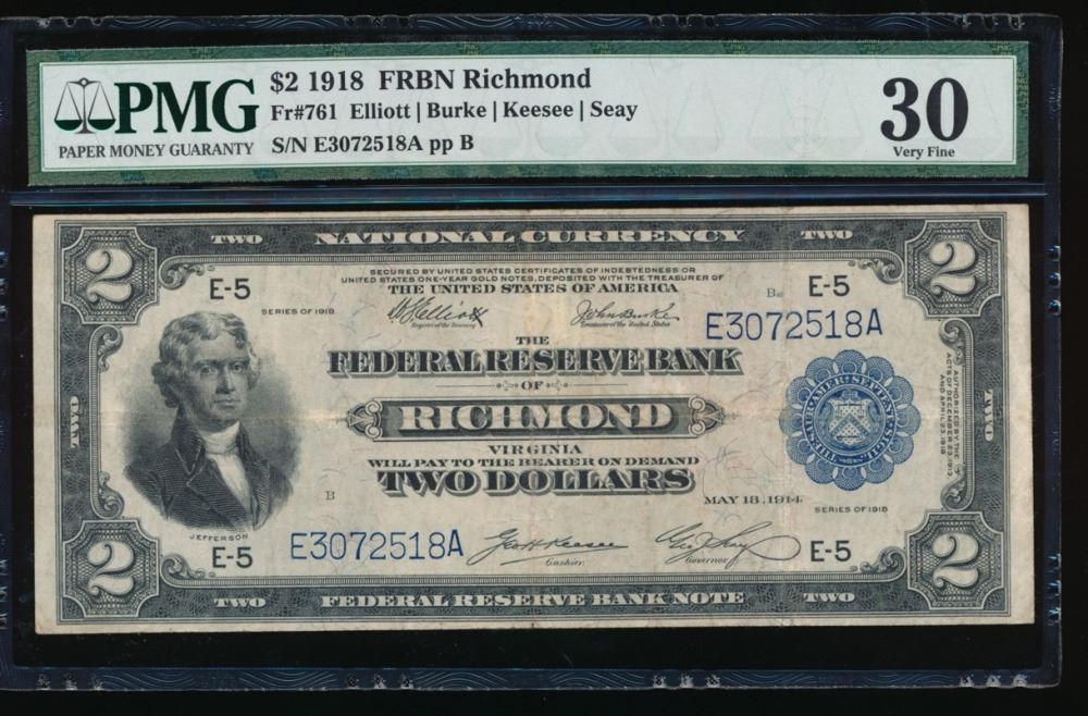 One 1918 $2 Richmond Federal Reserve Bank Note PMG 30.