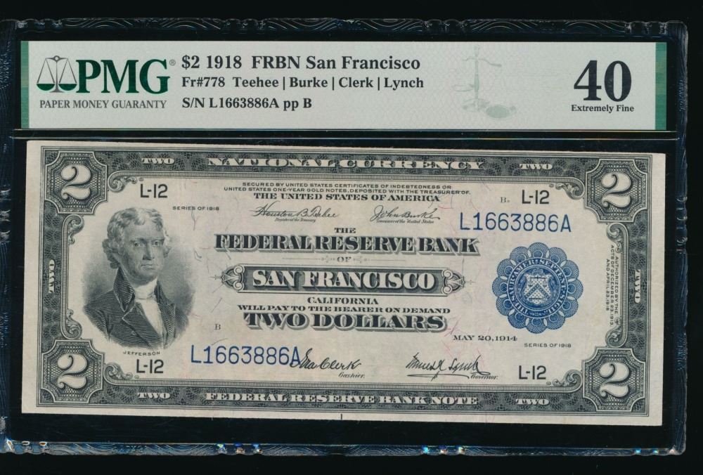 One 1918 $2 San Francisco FRBN PMG 40.