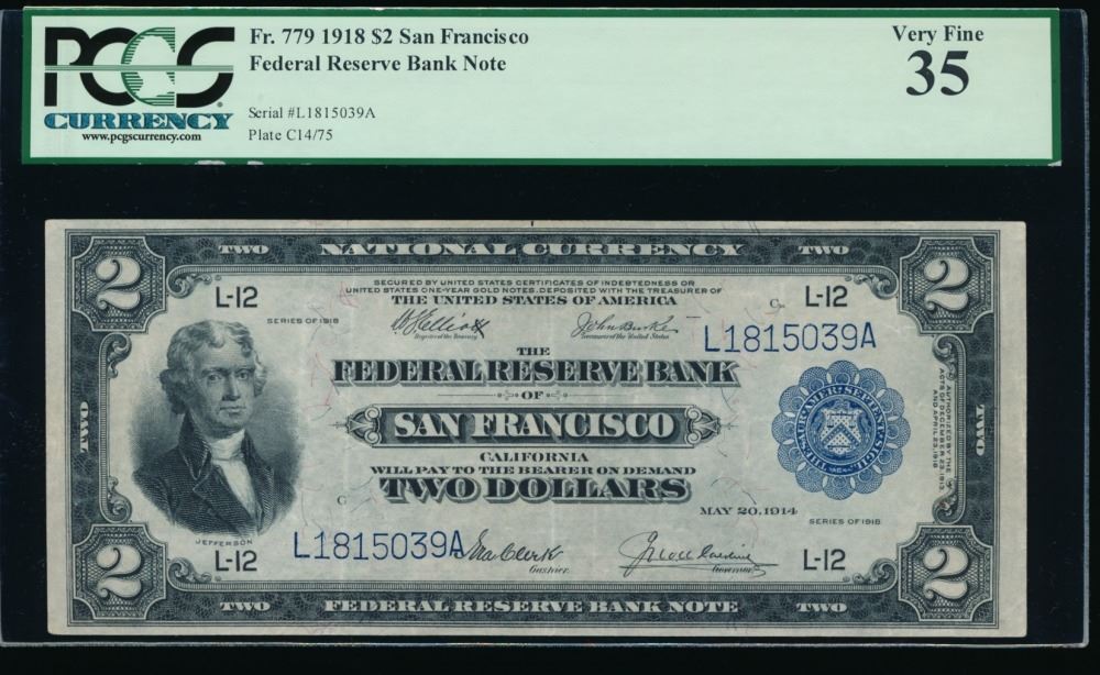One 1918 $2 San Francisco Federal Reserve Bank Note PCGS 35.