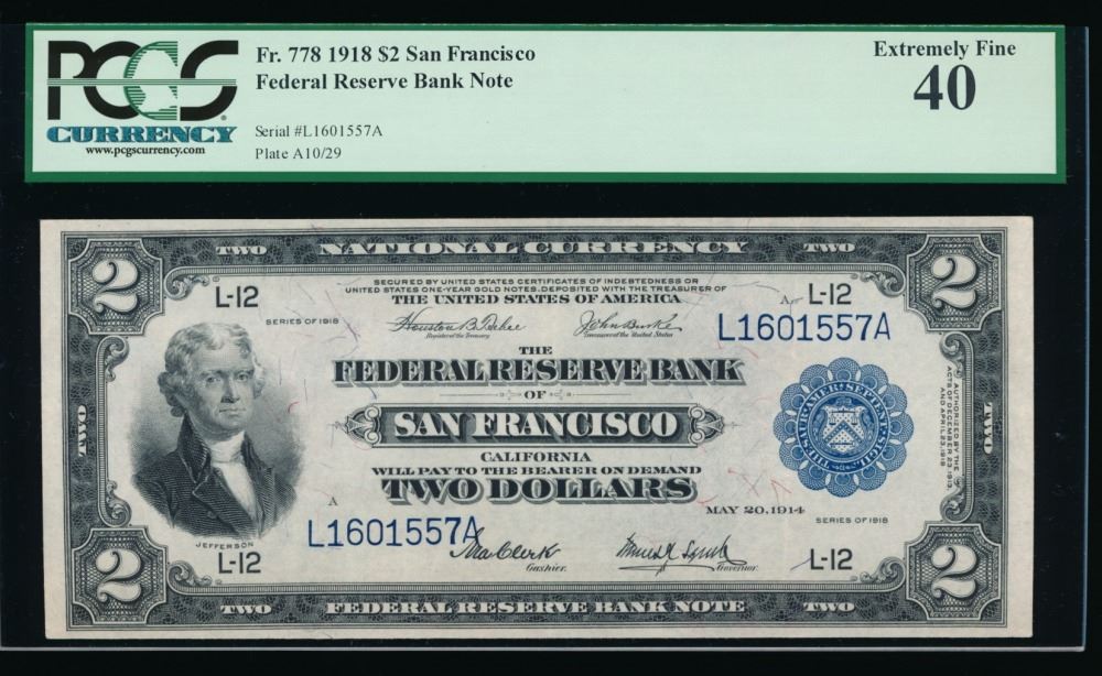 One 1918 $2 San Francisco Federal Reserve Bank Note PCGS 40.