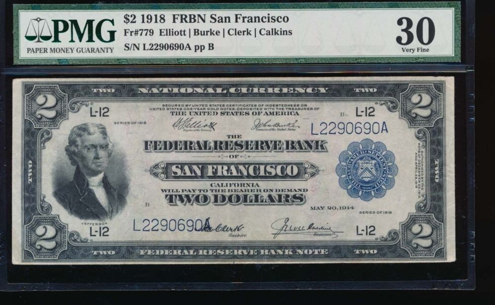 One 1918 $2 San Francisco Federal Reserve Bank Note PMG 30.