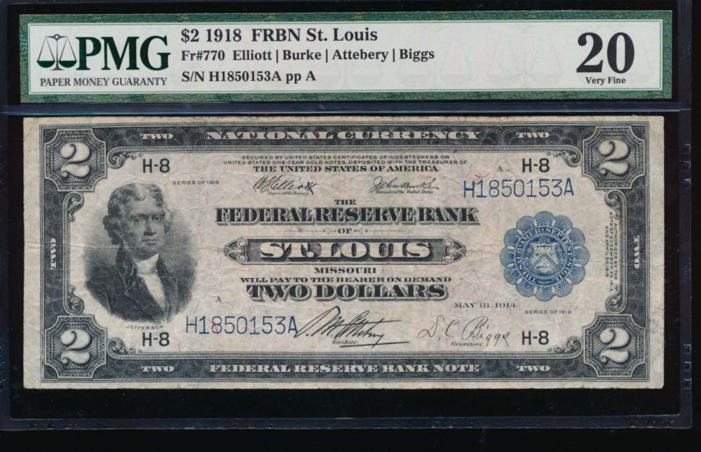 One 1918 $2 St Louis Federal Reserve Bank Note PMG 20.