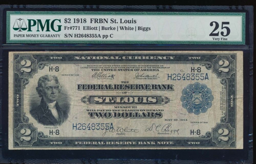 One 1918 $2 St Louis Federal Reserve Bank Note PMG 25.