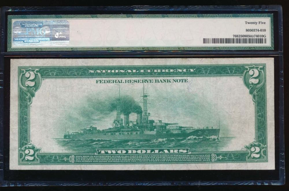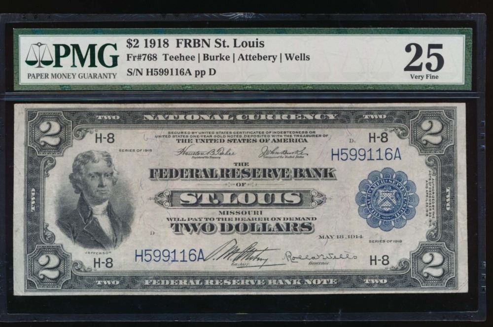 One 1918 $2 St Louis Federal Reserve Bank Note PMG 25.
