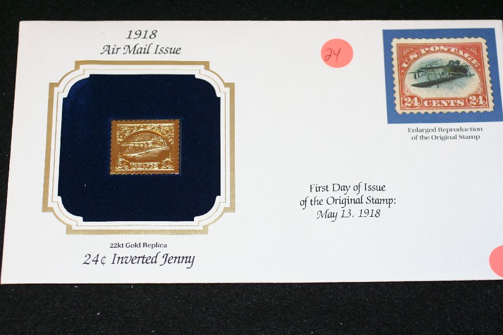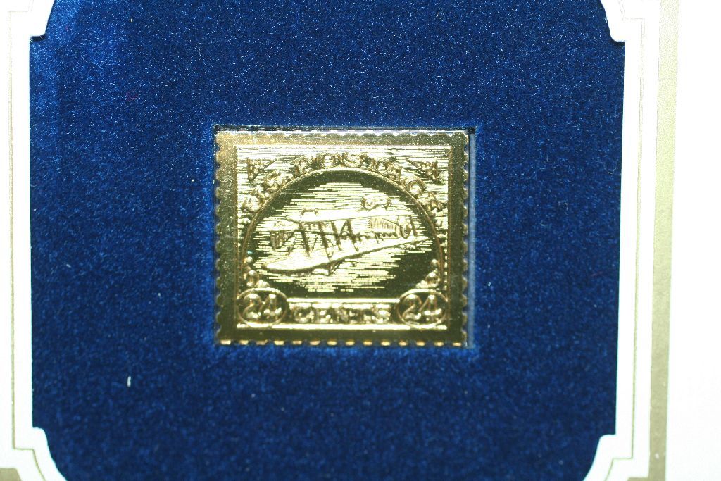 1918 22K Gold Replica First Day Issue of the Original Stamp W/Enlarged Reproduction of the Original Stamp; 24 Cent Inverted Jenny Air Mail Issue