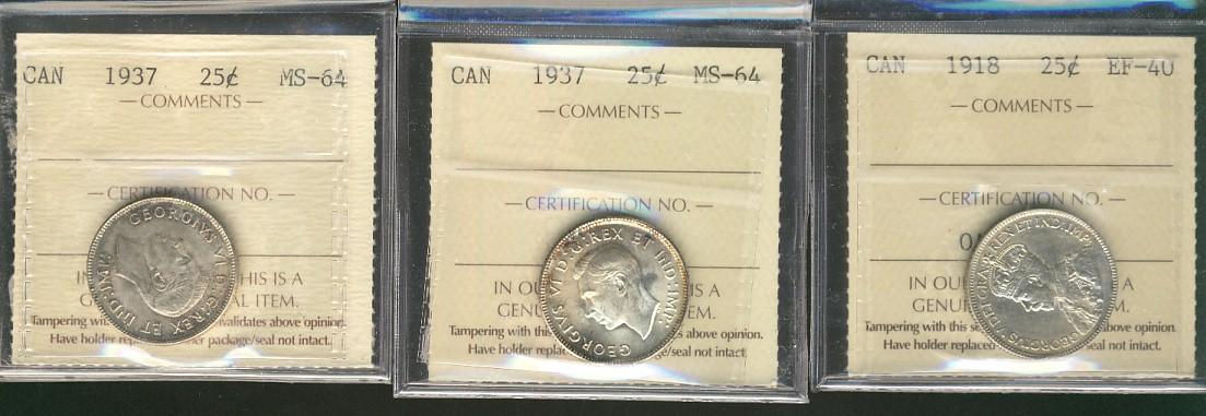 1918 25¢ EF40 & 1937 MS64(2). Lot of 3 coins.