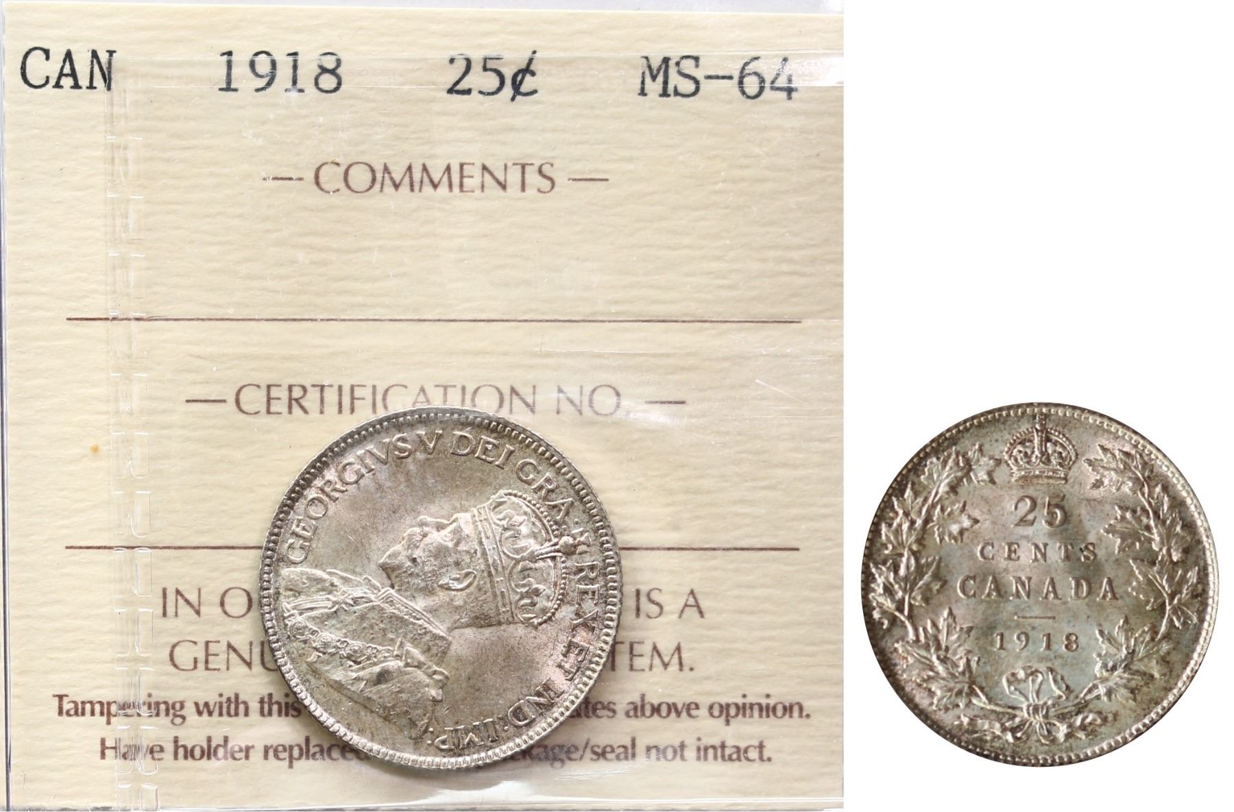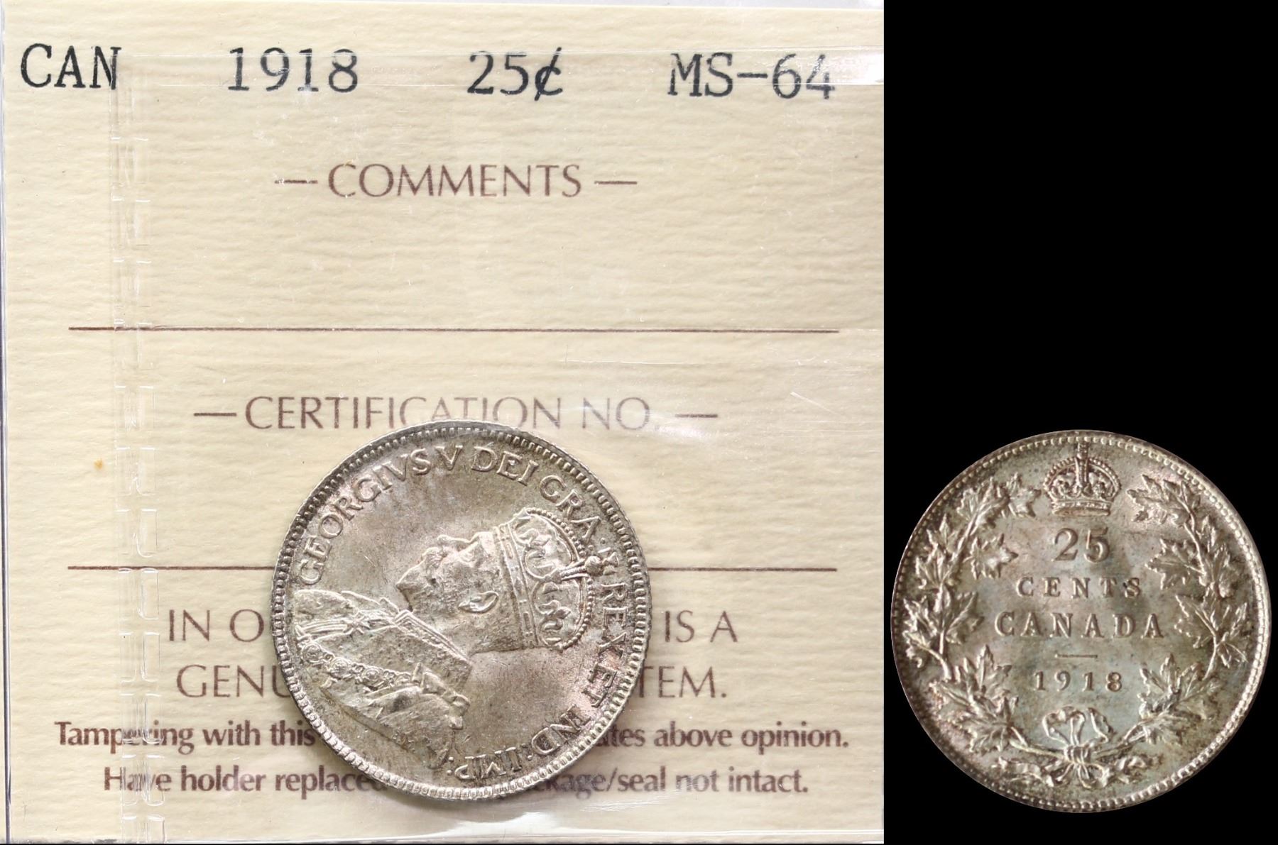 1918 25¢ ICCS Choice Mint State-64 Lustrous.
