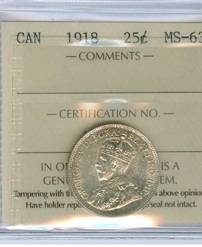 1918 25¢ ICCS MS63. Golden russet tone, quite attractive iss