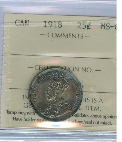 1918 25¢ ICCS MS65. PQ example with purple shade toning and gem fields.