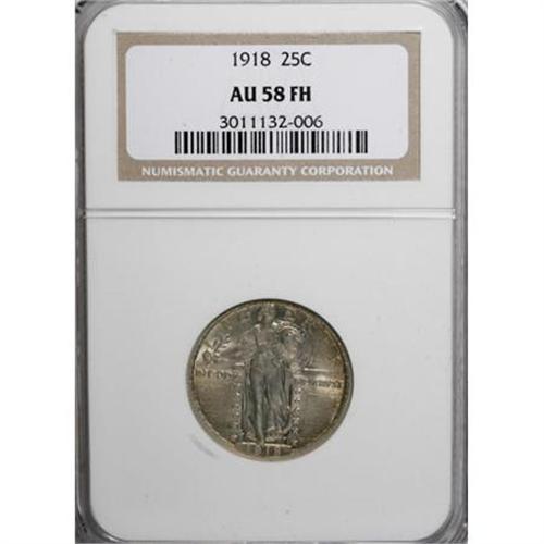 <B>1918 25C AU58 Full Head NGC.</B></I> NGC Census: (39/249). PCGS Population (35/342). Mintage: 14,240,000. Numismedia Wsl. Price for NGC/PCGS coin in AU58: $120. (#5721)<BR><BR><B>Coin Engraver:</B> Hermon A. MacNeil<BR><BR><b>Shipping:</b> Coins & Currency (<a target="_blank" href="http://www.heritageauctions.com/common/shipping.php">view shipping information</a>)