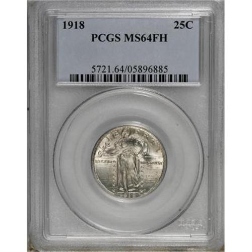<B>1918 25C MS64 Full Head PCGS.</B></I> . PCGS Population (129/108). NGC Census: (98/64). Mintage: 14,240,000. Numismedia Wsl. Price for NGC/PCGS coin in MS64: $525. (#5721)<BR><BR><B>Coin Engraver:</B> Hermon A. MacNeil<BR><BR><b>Shipping:</b> Coins & Currency (<a target="_blank" href="http://www.heritageauctions.com/common/shipping.php">view shipping information</a>)