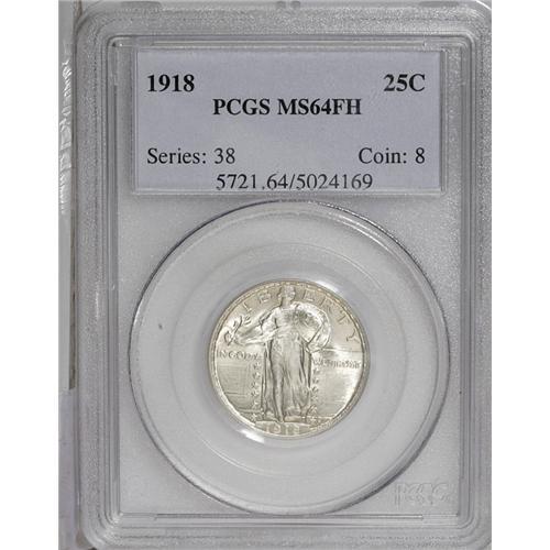 <B>1918<25C> MS64 Full Head PCGS.</B></I> Brilliant and sharply struck, though scattered abrasions on both sides preclude Gem status. The most noteworthy abrasion is on Liberty's left (facing) leg.