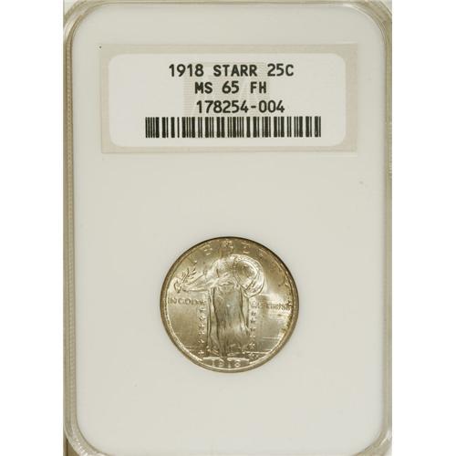 <B>1918 25C MS65 Full Head NGC.</B></I> Ex: Starr. Lilac-gray and almond-gold shadings endow this lustrous and crisply struck Gem. Encapsulated in an older NGC holder. Starr's well-rounded collection included the finest known 1884 trade dollar.<BR><I>Ex: Floyd T. Starr Collection (Stack's, 10/92), lot 425.</B></I><BR><BR><b>Shipping:</b> Coins & Currency (<a target="_blank" href="http://www.heritageauctions.com/common/shipping.php">view shipping information</a>)