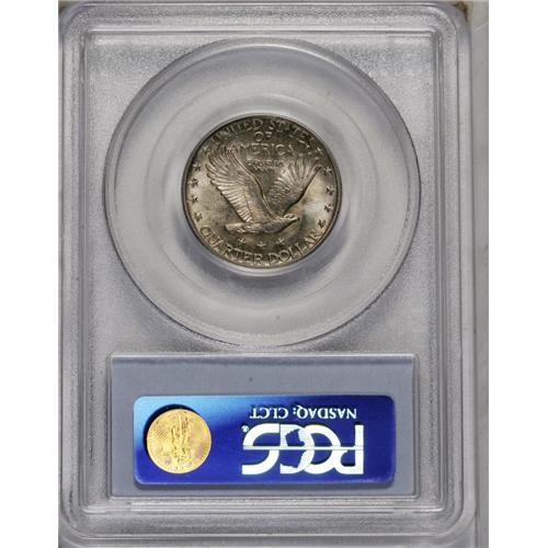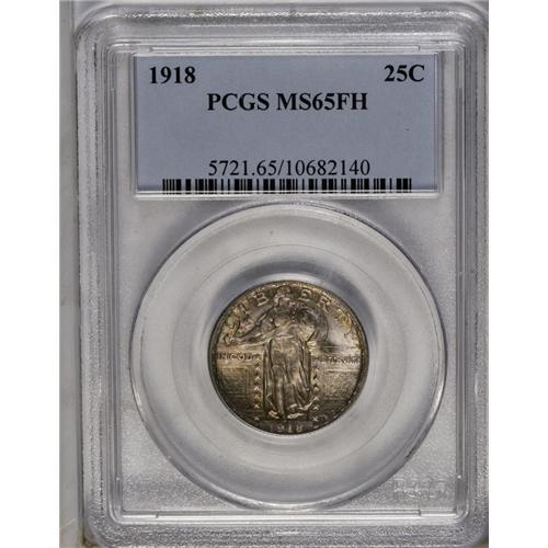 <B>1918<25C> MS65 Full Head PCGS.</B></I> A colorful, highly lustrous example of an early Standing Liberty quarter. The obverse displays variegated colors ranging from lilac-gray and rose to lime-gold. The reverse exhibits mottled shades of lilac-gray and sea-green. The collector seeking a fully original, well detailed example of MacNeil's lovely design need look no further. Population: 67 in 65 Full Head, 32 finer (5/06).