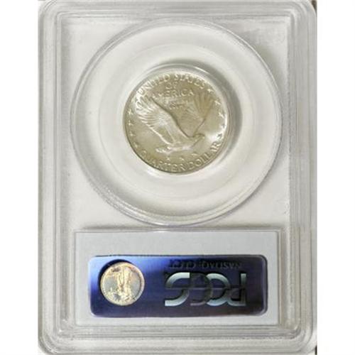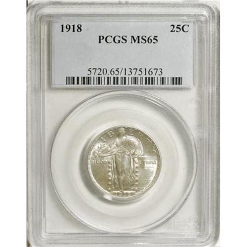 <B>1918 25C MS65 PCGS.</B></I> This Gem example of the early 1918 Standing Liberty quarter reveals a remarkable level of preservation which is not often seen on other survivors. Neither side of the piece displays any mark that is evident to the unaided eye. All of the shield rivets are crisply struck, and Liberty's head detail is nearly full. Population: 61 in 65, 20 finer (8/07). <BR><BR><B>Coin Engraver:</B> Hermon A. MacNeil<BR><BR><b>Shipping:</b> Coins & Currency (<a target="_blank" href="http://www.heritageauctions.com/common/shipping.php">view shipping information</a>)