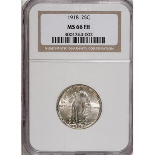 <B>1918 25C MS66 Full Head NGC.</B></I> Liberty's head is full, and the details on both sides are well-defined, thanks to a bold strike and careful preservation. The luster is blazing and undimmed by toning, save a bit of charcoal toning that is seen clinging to the rims. Extremely clean and very appealing in every way. Census: 18 in 66, 3 finer (11/07).<BR><BR><B>Coin Engraver:</B> Hermon A. MacNeil<BR><BR><b>Shipping:</b> Coins & Currency (<a target="_blank" href="http://www.heritageauctions.com/common/shipping.php">view shipping information</a>)