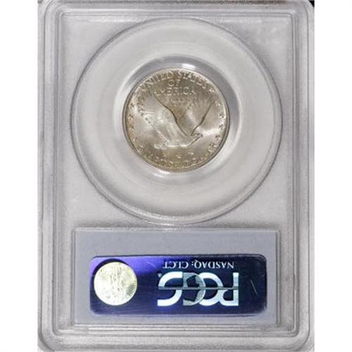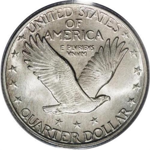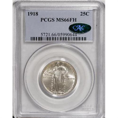 <B>1918 25C MS66 Full Head PCGS. CAC.</B></I> A powerful strike transcends the Full Head to exert itself on all of the design elements. This includes sharp definition on the date, the top half of which is often soft on this issue according to J.H. Cline (2007), the inner shield and the rivets, and the eagle's plumage. Intensely lustrous surfaces reveal wisps of light tan-gray color gravitating to the margins. A couple of small obverse marks do not overly detract. Population: 29 in 66 Full Head, 10 finer (11/07). <BR><I>From The Hoffy Collection, NGC's #3 Registry Collection of Standing Liberty Quarters.</B></I><BR><BR><B>Coin Engraver:</B> Hermon A. MacNeil<BR><BR><b>Shipping:</b> Coins & Currency (<a target="_blank" href="http://www.heritageauctions.com/common/shipping.php">view shipping information</a>)