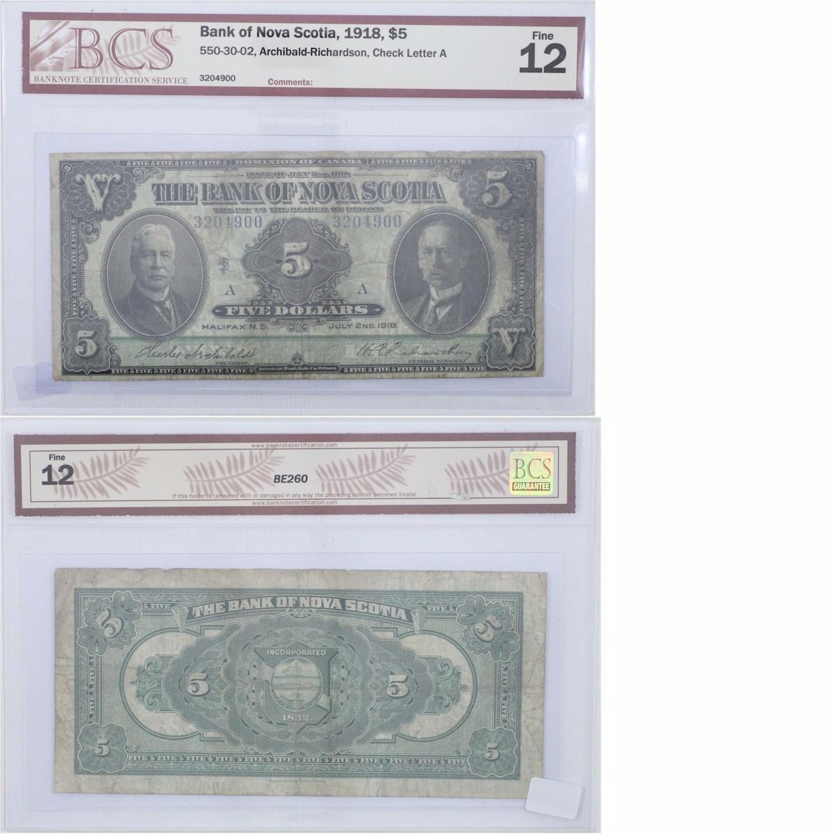 1918 $5.00 note from the Bank of Nova Scotia; cat code 550-30-02, Archibald-Richardson signatures, BCS Certified F-12