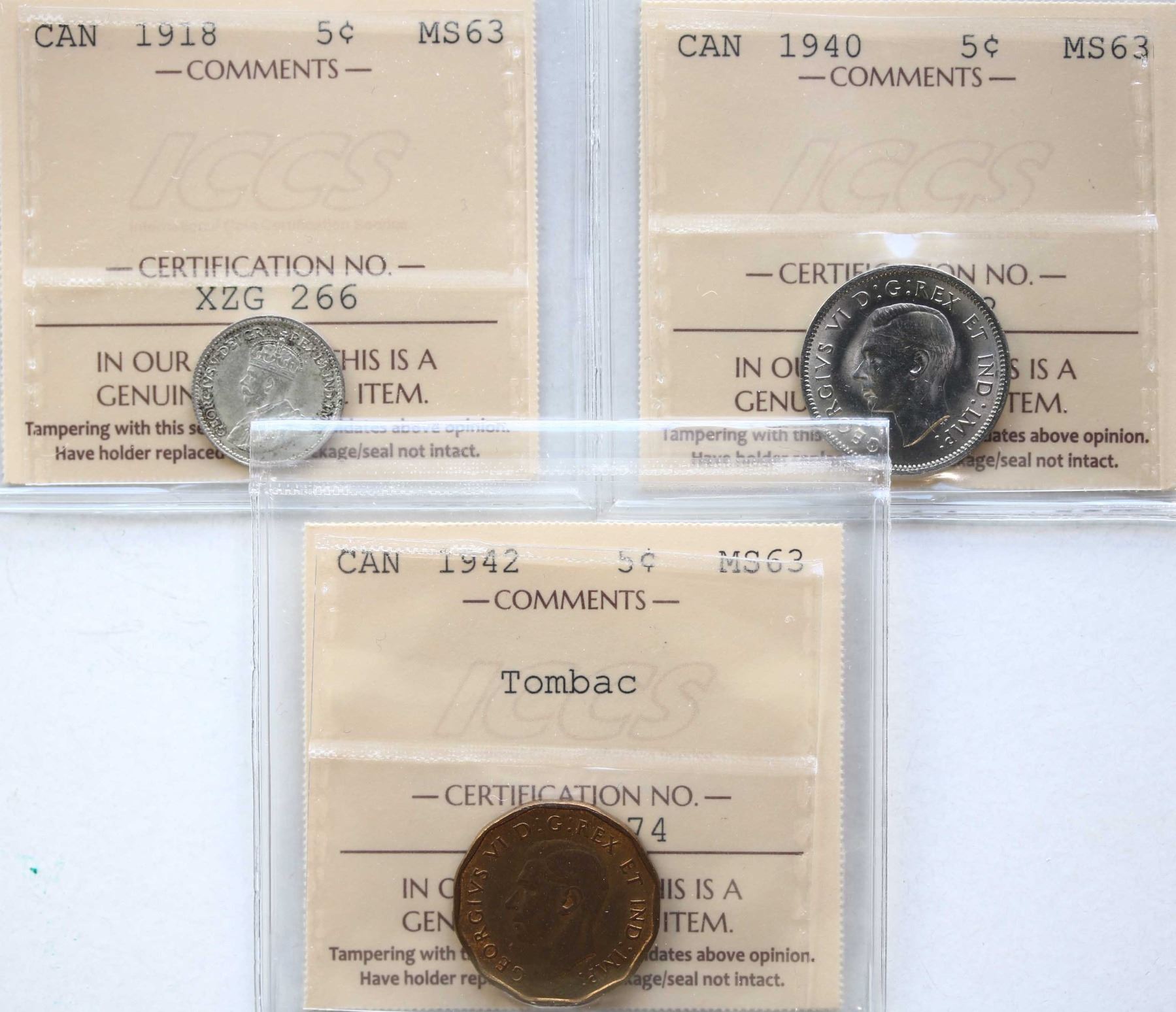 1918 5¢, 1940, 1942 Tombac, All 3 coins ICCS Choice Mint State-63