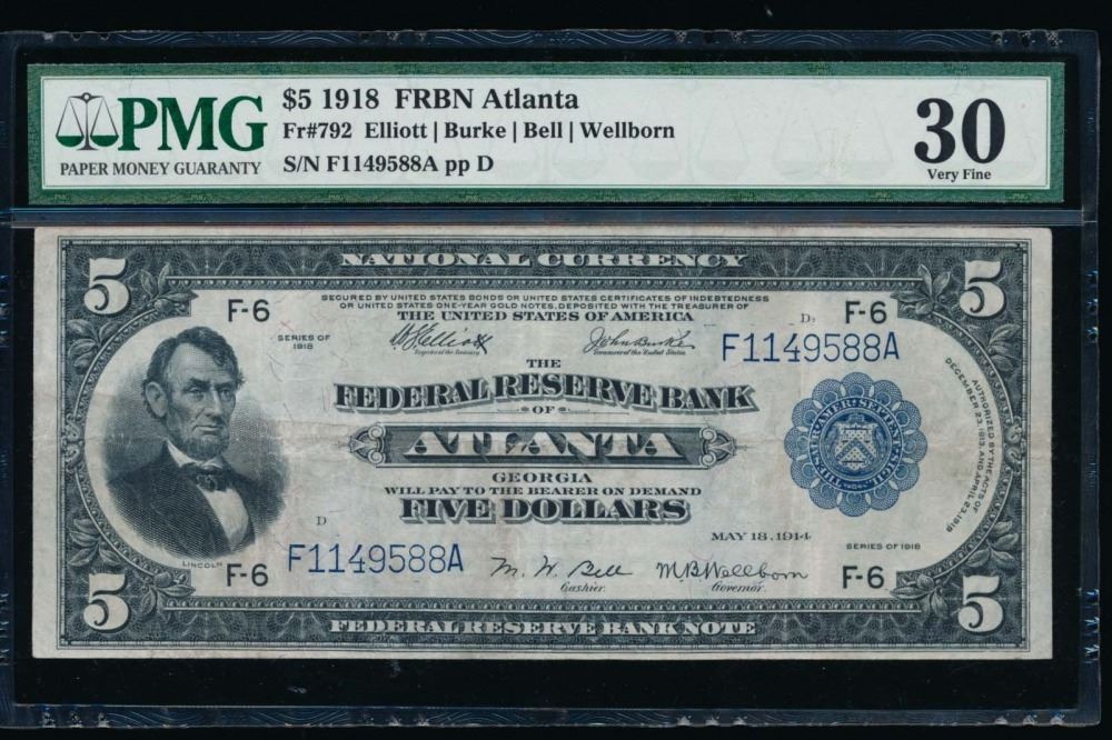 One 1918 $5 Atlanta Federal Reserve Bank Note PMG 30.