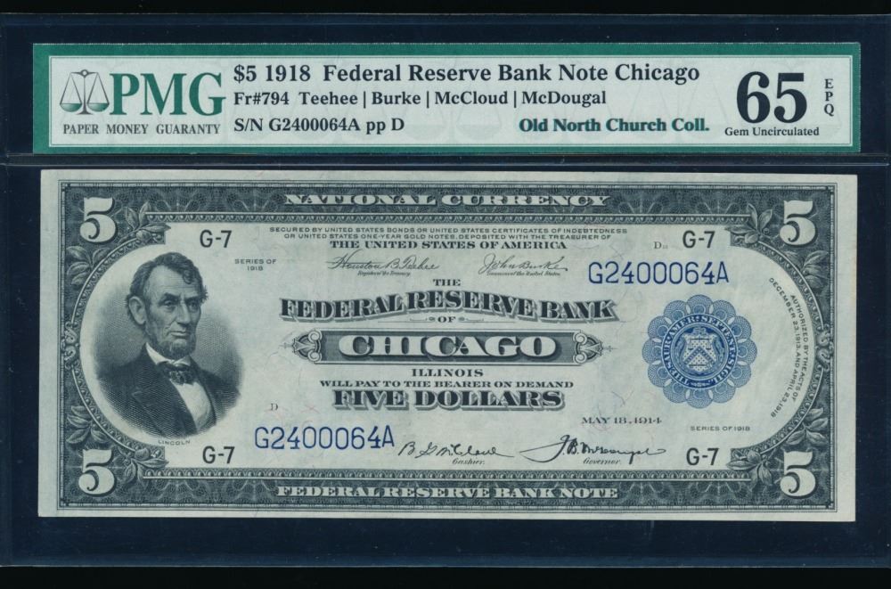 One 1918 $5 Chicago Federal Reserve Bank Note PMG 65EPQ.